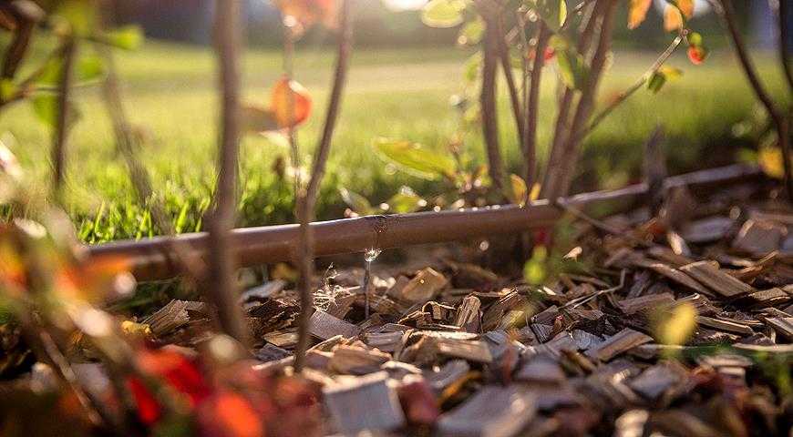 Деревья расположены на большом расстоянии друг от друга, культуры высаживают только параллельно. Допустимо наземное и подземное прокладывание системы. Говоря о преимуществах, которые есть у капельного полива, на первом месте стоит экономность воды.
