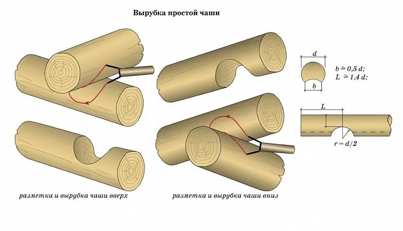 Разметку бревна рекомендуется выполнять с помощью черты или химического карандаша. Плотницкий топор перед началом сруба нужно тщательно заточить. Это облегчит вырезание чаши, а также поможет избежать лишних нагрузок и травм. Дно углубления делают гладким, чтобы зазор при укладке был минимальным.