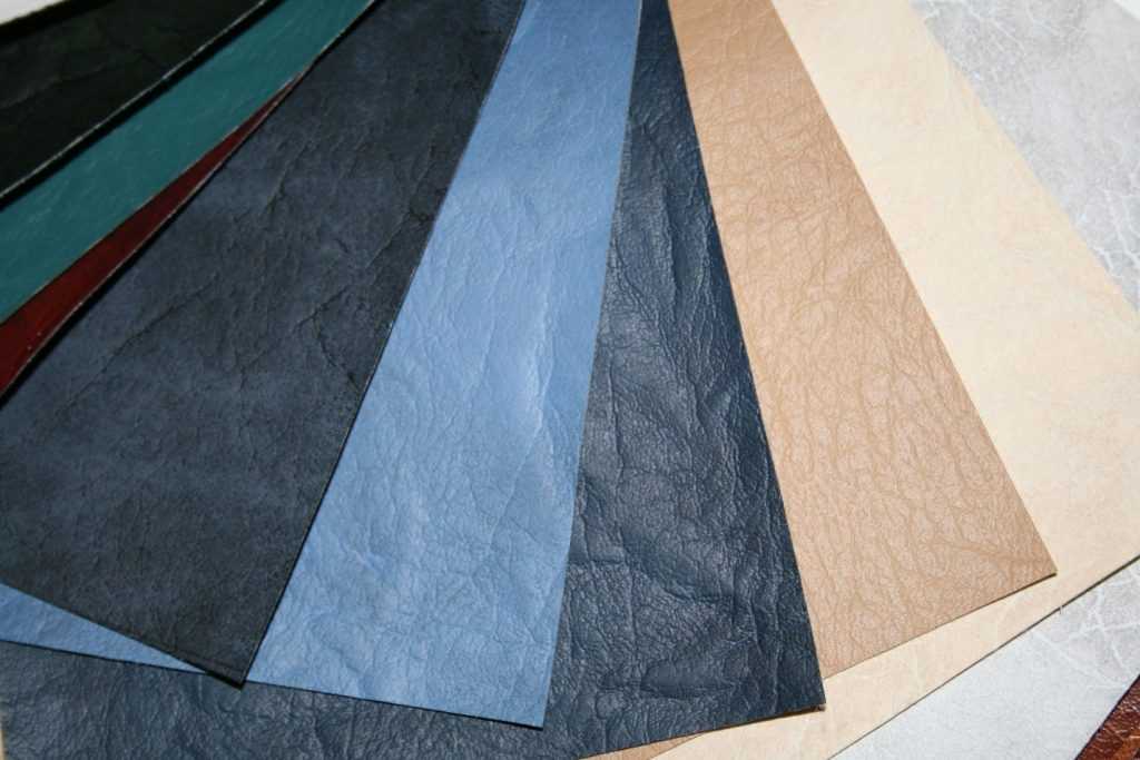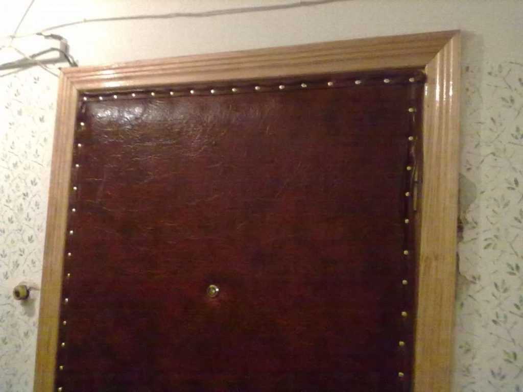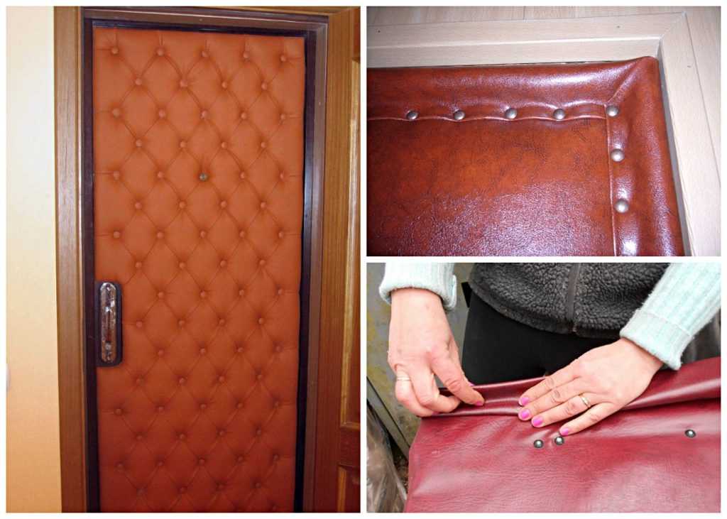 Обивка материалами под кожу – это возможность не только преобразить, но и утеплить дверное полотно. Достаточно приобрести материал для обтягивания (винилискожа, кожзаменитель, дерматин, ПВХ-пленка) шириной на 10-15 см больше, чем дверной блок, а также поролон в соответствии с размерами полотна и декоративные гвоздики. Сначала на дверь укладывается поролон, сверху искусственная кожа, которая затем прибивается гвоздиками по периметру (края необходимо подгибать).