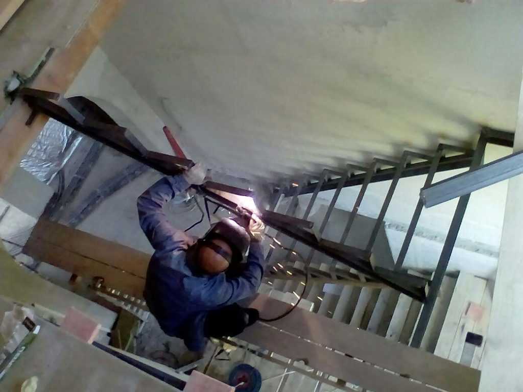 После того как места для крепления ступеней готовы, необходимо закрепить сам марш. Косоуры нужно сварить сверху с анкерами, которые закреплены к межэтажному перекрытию. Нижний конец устанавливаем на опорную платформу, вмурованную в пол первого этажа.