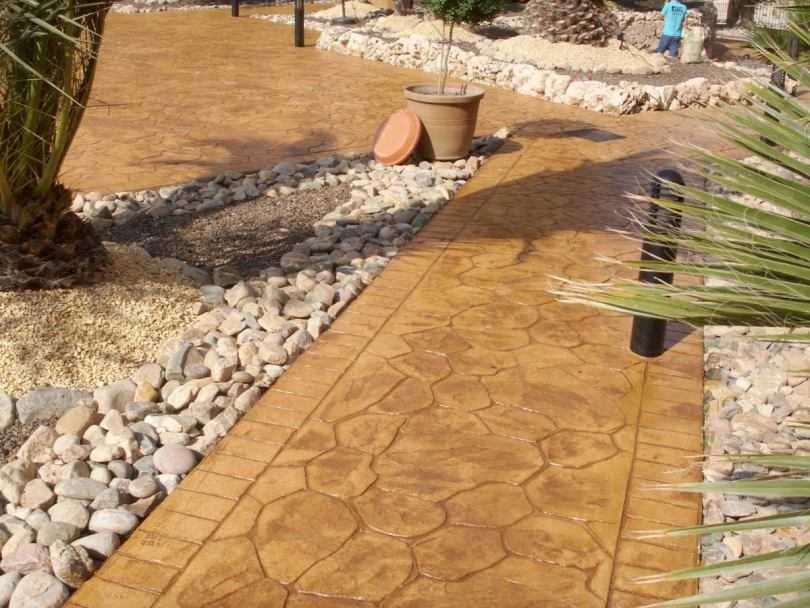 Такой вариант делается на свежезалитой поверхности монолитной бетонной дорожки. Применив специальную форму-штамп, вы достигнете красивого результата. Принцип заключается в отпечатывании фактуры в незатвердевшем бетоне. После удаления форм останется незамысловатый рисунок.