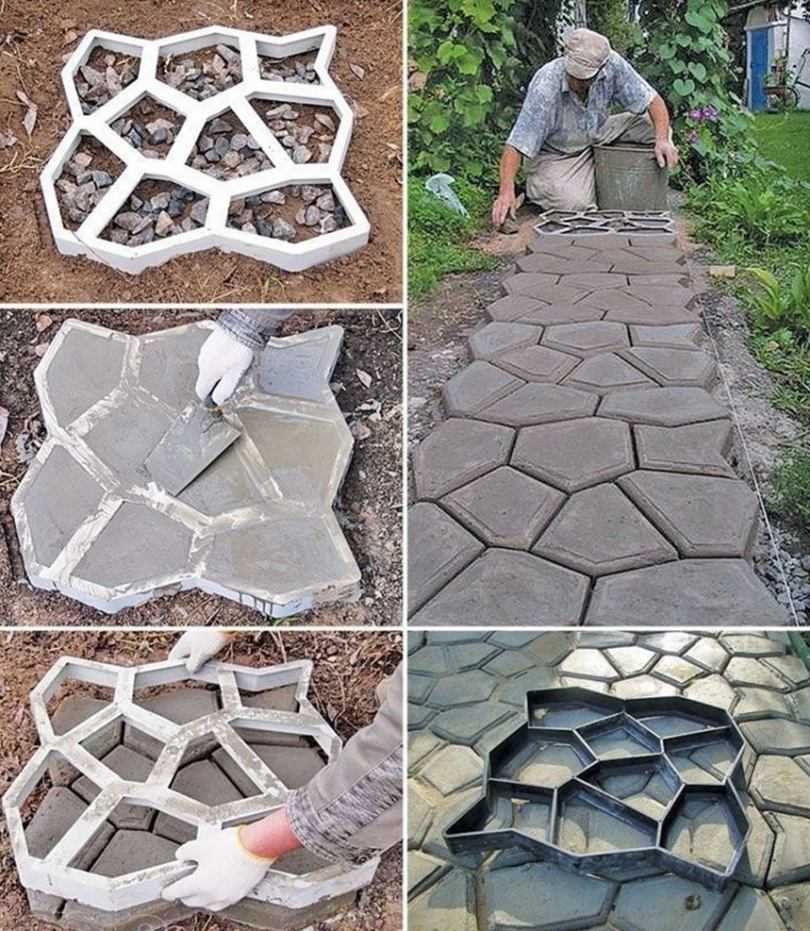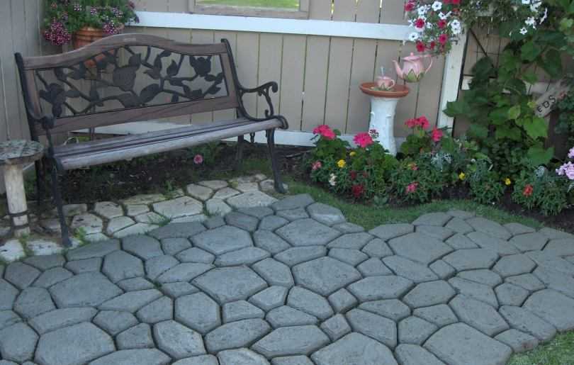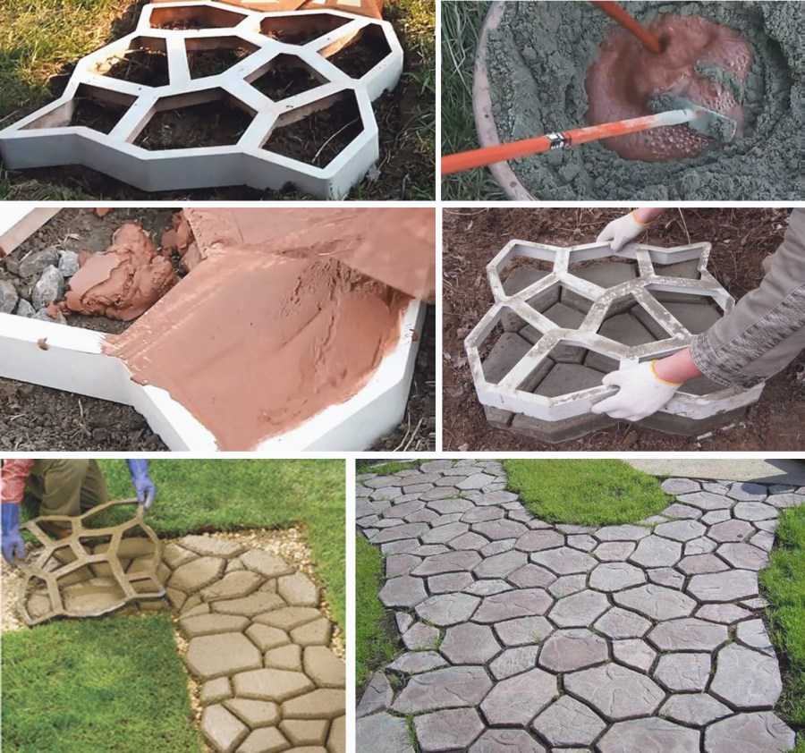 Раствор, как правило, заливается в формы, которые могут быть различного рисунка: прямоугольные, многоугольные, круглые, имитирующие природный камень. В продаже часто встречаются формы из полипропилена, с помощью которых можно быстро сделать целые кусочки дорожки с красивым узором.