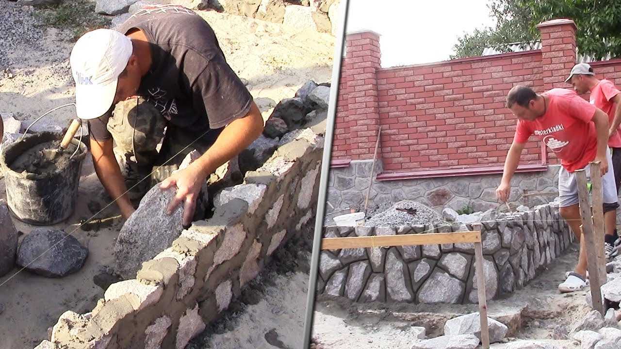 После того как готов фундамент и вдоль планируемой каменной стены (забора или цоколя) будут натянуты маячные бечевки, означающие плоскость стены, нужно сделать предварительную сортировку камня.