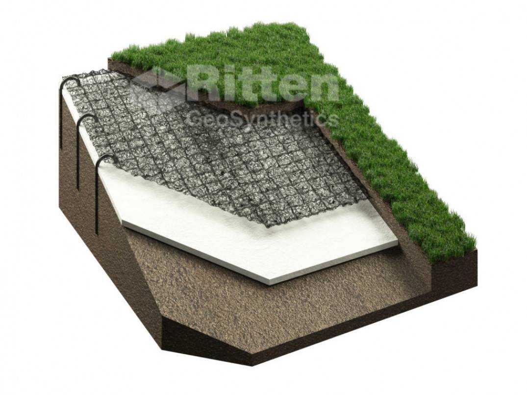 Укладка геомата марки «Риттекс» не требует привлечения специальной техники или персонала. Крепиться такой материал специальными анкерами. Под геомат рекомендуется стелить геотекстиль марки «Риттекс» плотность 300.