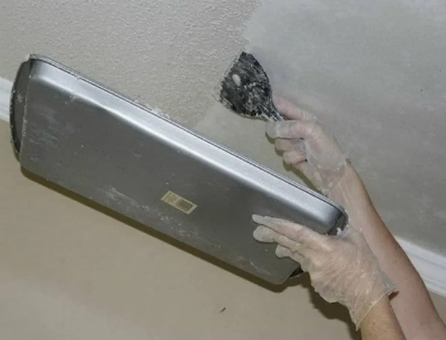 Если площадь комнаты небольшая, удобно воспользоваться способом сухой очистки. Обычно работают острым шпателем, но можно дополнить его, например, пакетом (закрепить на ручке), чтобы было удобнее.