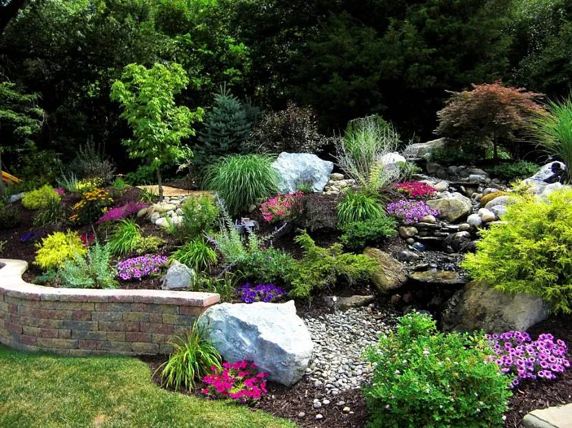 - концепция участка должна выбираться на основе рельефа. Чтобы уменьшить траты на выравнивание территории, расположите на склоне красивые альпийские горки, а также маленькие цветники;