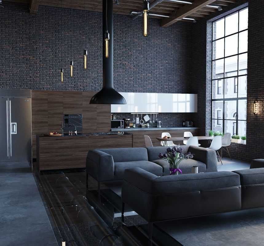 На следующем примере сразу можно не заметить стекло на полу, так как интерьер студии в стиле лофт очень тёмный, но есл вы присмотритесь, то увидите что часть напольного покрытия — это стеклянное полотно. Ножки дивана стоят прямо на стекле.