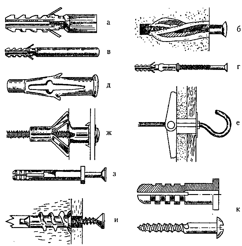 Существует множество различных вариантов дюбелей. Каждый вид механизма рассчитан на определенную массу, материал и способ крепления. От правильности выбора и крепления зависит надежность установки монтируемых деталей интерьера.