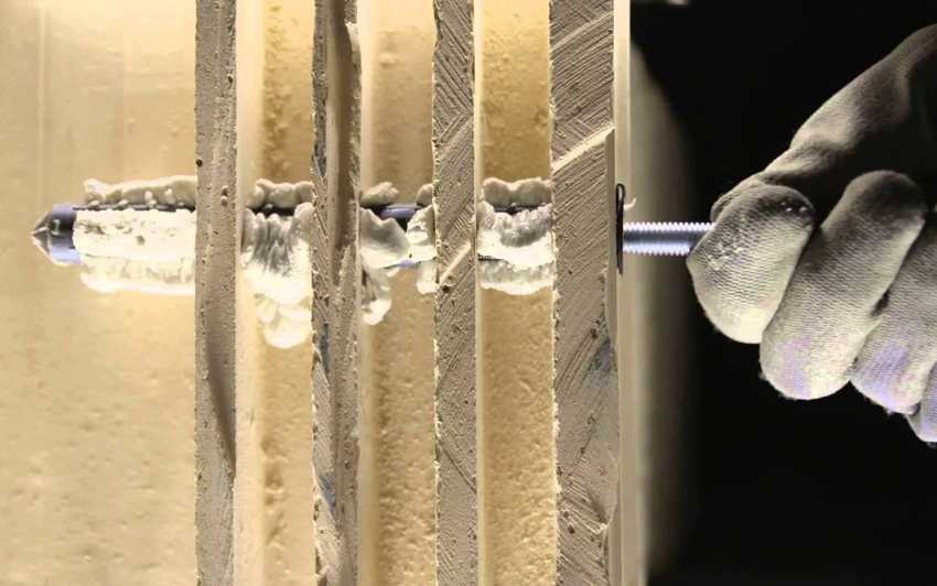 Данный тип крепежа отличается от всех остальных. В составе конструкции есть капсула с клеем и металлический шуруп. Обычно используют такой крепеж для газобетона.