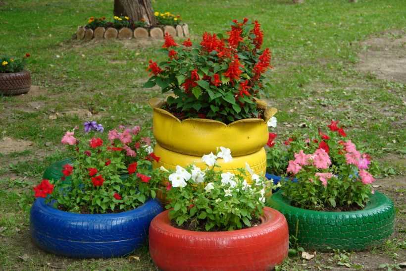 Эффектно оформить клумбу своими руками можно из долговечных автомобильных покрышек. Легко перемещаемые клумбы можно компоновать в различном порядке, создавая забавные цветущие сооружения в несколько рядов.