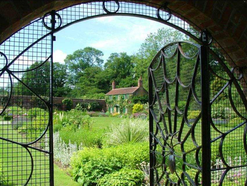 Сквозь открытый тип кованой калитки можно видеть, что находится на участке
