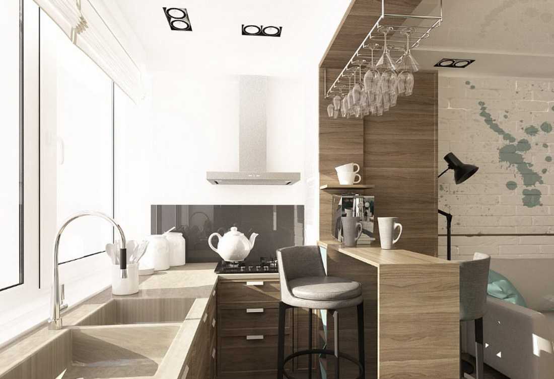 - Снос балконного блока с полным сохранением стены и перегородки на кухне. Это самый безболезненный вариант, который не потребует муторных согласований в инстанциях, но в случае продажи квартиры окно с дверью нужно будет вернуть на свое место. Оставшуюся же нижнюю перемычку можно превратить в барную стойку для создания современного дизайна новой кухни.