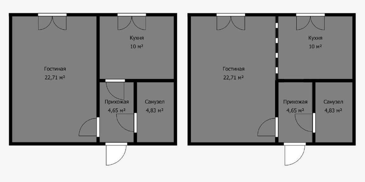 Создать видимость дверей. В проекте перепланировки предусматривают двери или перегородку на кухне с газовой плитой, согласовывают, составляют акт приемки — все в рамках закона. Затем проверяющие уходят, а дверь или перегородку демонтируют. Иногда дизайнеры заранее продумывают, как скрыть направляющие перегородки на полу и потолке после того, как перепланировка будет согласована.