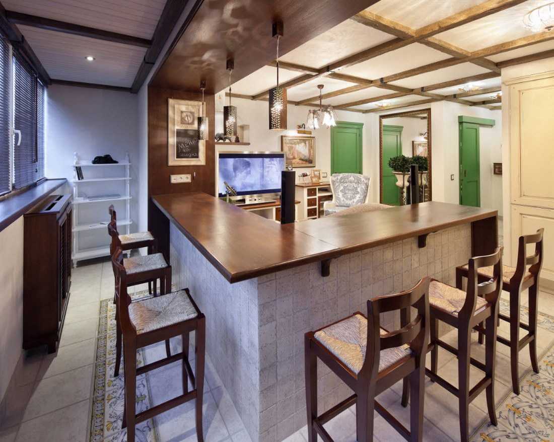 В зоне перегородки рекомендуется установить барную стойку. Такое решение следует принимать, если стенка между балконом и кухней несущая. Стойка выполняет роль обеденного стола.