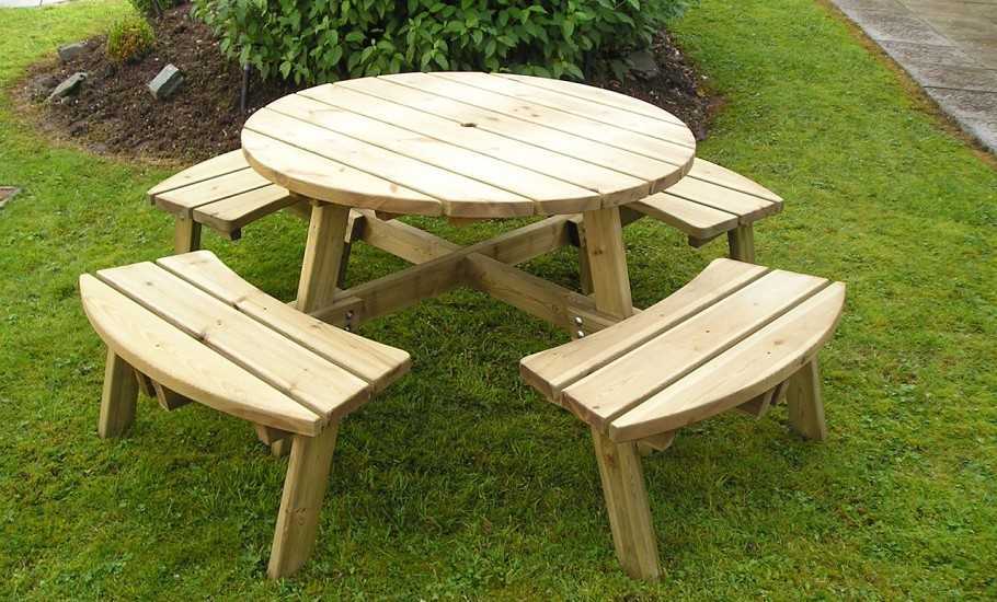 садовая мебель из сосны включает различные столы, табуреты, стулья, скамьи. Конструкция изделий предусматривает быстрый сток воды с поверхности, хорошую вентиляцию. Использование специальных защитных покрытий повышает срок использования гарнитуров. При эксплуатации в саду мебель часто царапают, повреждают, но сосновые изделия легко реставрируются;
