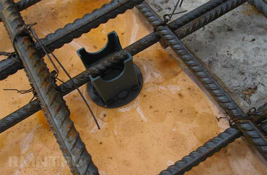 - Для того чтобы арматура нижнего яруса была закрыта слоем бетона, на листы фанеры с шагом 1,0-1,2 м устанавливают пластиковые фиксаторы.