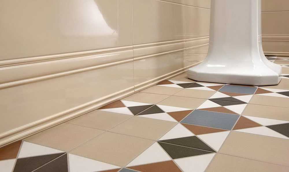 Если на плитке есть орнамент, то целесообразнее всего выбрать однотонный плинтус, который будет акцентировать внимание на узоре плитки
