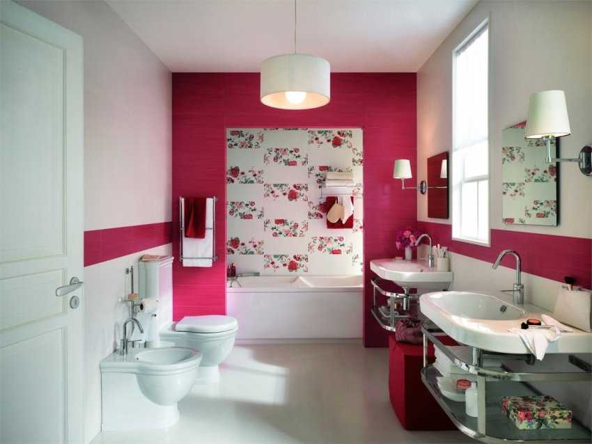 Розовый цвет является воплощением чувственности и романтизма. При выборе обоев в розовом цвете лучше отдавать предпочтение вариантам с буйными цветочными мотивами, что позволит воссоздать легкий и воздушный прованс в ванной.
