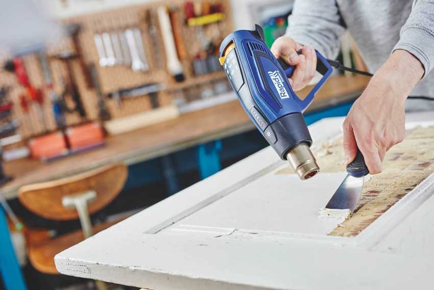 Процесс снятия старой краски с двери с помощью строительного фена