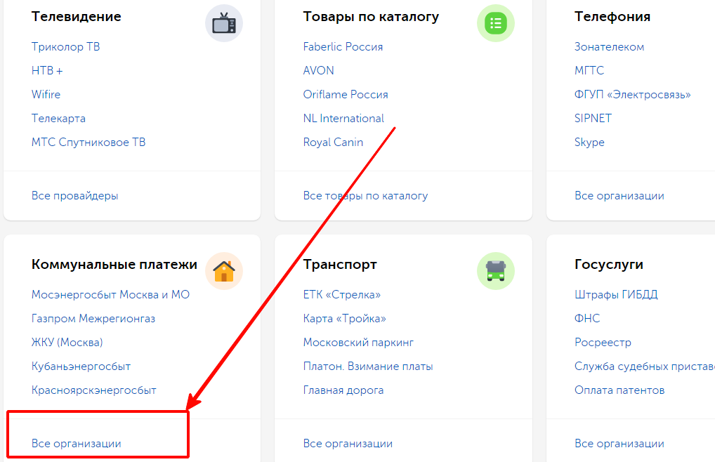 В верхней строке меню перейдите в раздел “Платежи” и найдите блок “Коммунальные платежи”. В нём нужно открыть все организации.
