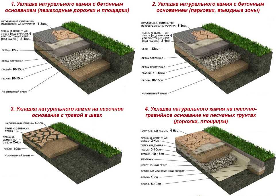 Такой основой в большинстве случаев служит бетонная стяжка толщиной 50-100 мм. Если вы на такую основу уложите природный песчаник, толщина которого составляет не менее 30 мм на раствор в 10-20 мм, то такая поверхность выдержит даже грузовые автомобили. Бетонная стяжка при этом должна быть армирована строительной сеткой из арматуры с шагом не более 100 мм. Возможен вариант такого же армирования и под раствор, но сеткой из более тонкой проволоки. Раствор должен быть крепким и прочным. Но и основа под кладку должна быть соответствующей.
