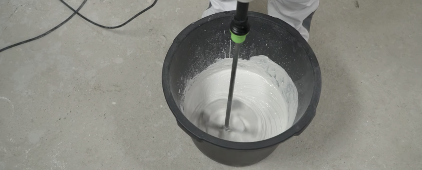 Затворение сухой шпаклёвки делается аналогично затворению Ротбанда, только пропорции тут свои: на один мешок (25 кг) требуется 16–17 л воды, или 0,65–0,7 литра на 1 кг сухой смеси. После засыпки смеси в воду рекомендуется оставить её на 2–3 минуты для впитывания – и только потом перемешать, а через 5–8 минут перемешать повторно.