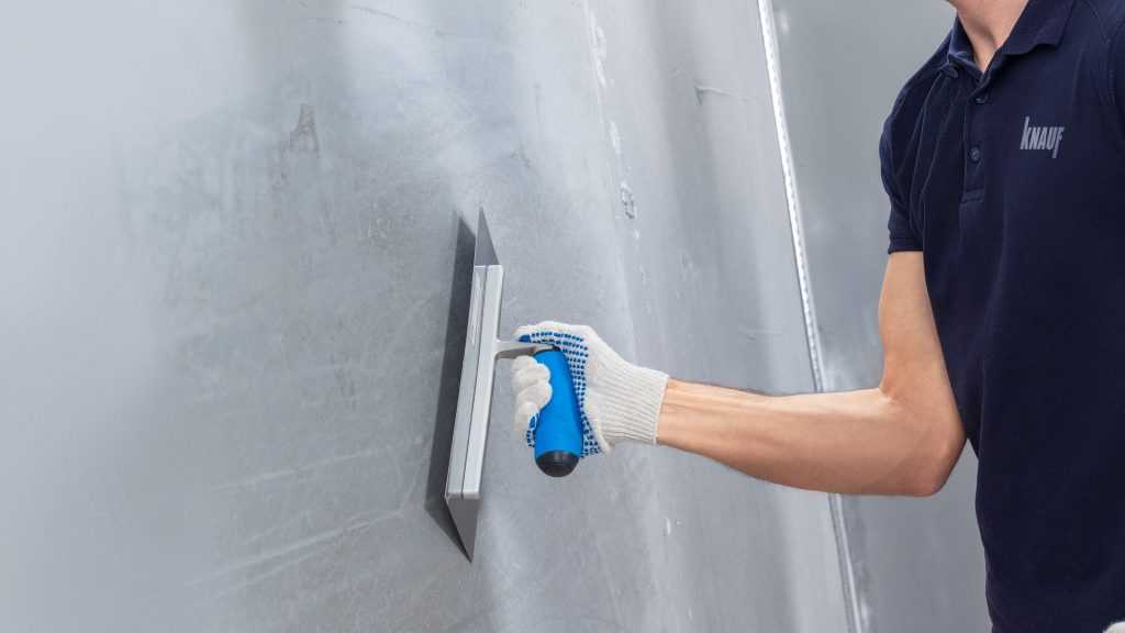 Как мы уже сказали вначале, для этой задачи предназначена шпаклёвка КНАУФ-Ротбанд Финиш. Она стойкая к образованию трещин, легко выводится «в ноль» — то есть позволяет делать незаметные переходы от зашпаклёванной поверхности к участкам без шпаклёвки, не пылит, а приготовленный раствор сохраняет жизнеспособность более 1,5 часов.
