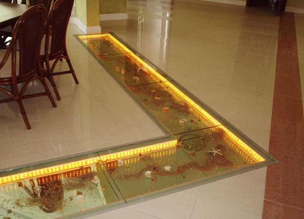 - в пол – вместо напольной плитки или вдоль стен;