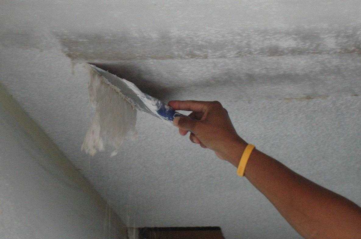 С помощью шпателя можно удалить старое покрытие с потолка, смочив перед этим поверхность мыльной водой