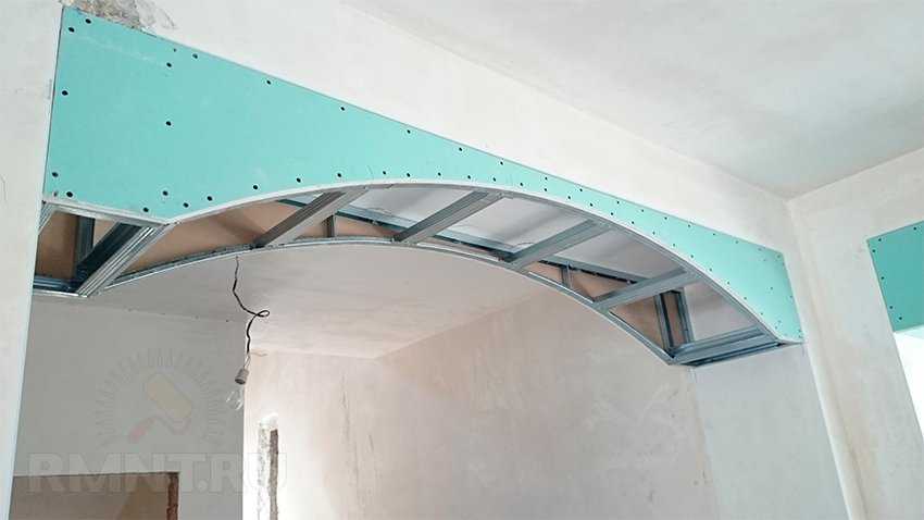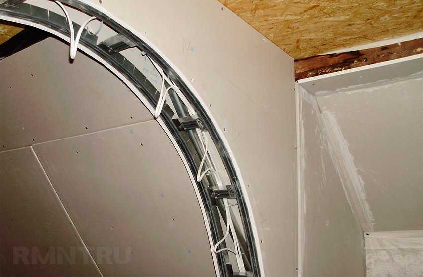 После того как закреплены обе стенки, к ним изнутри через гипсокартон прикручивают две полосы арочного профиля для крепления свода. Если арочного профиля нет, то его делают из CD профиля, симметрично вырезая по бокам клинья на расстоянии 4-5 см друг от друга.