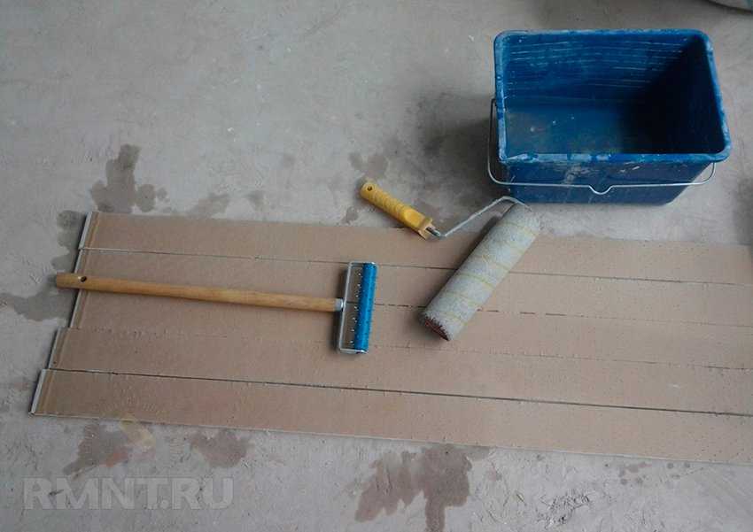 Чтобы согнуть дугой полосу заготовки, её перед установкой с двух сторон смачивают губкой. Затем с одной стороны прокатывают игольчатым валиком (другой способ — наколоть шилом по всей поверхности на 1/3 толщины листа) и ещё раз смачивают уже только по перфорированной стороне. Ставят на пол под углом к нему и стене. Когда заготовка начинает гнуться под собственным весом, её прикручивают на место к арочным профилям.