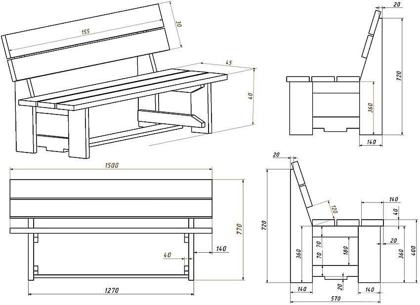 На чертеже нужно отобразить все элементы скамейки, а также их размеры, чтобы в будущем легко собрать единую конструкцию. Классический чертеж предусматривает следующие элементы: