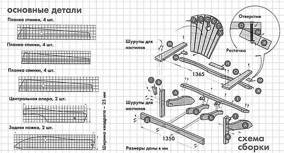 Любителям философски-романтического тет-а-тет на лоне природы, возможно, понравится парное садовое кресло-скамейка со спинкой и столиком. Для томика любимых стихов, разумеется. Схема его устройства показана на рис. справа, а чертежи и схема сборки на рис. ниже. Материал везде – 30-мм доска. Изделие это рассчитано уже на достаточно опытных мастеров, т.к. выкройки даны только на фасонные детали (там шаг координатной сетки 10 мм), а прочие размеры придется восстанавливать по базовой сетке (см. приложение); образующий радиус выемок под спинки в задней опоре 1300 мм.