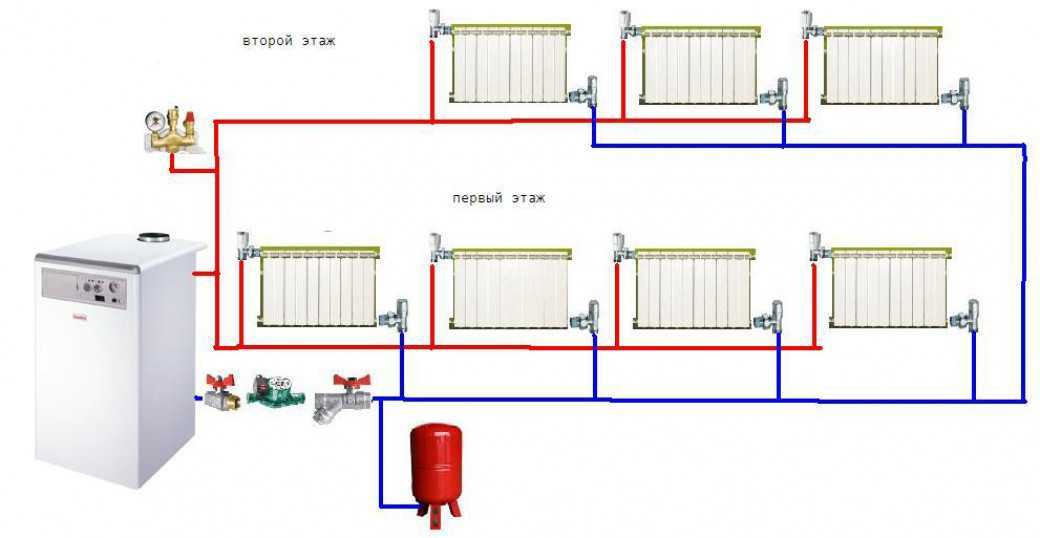 Схема закрытой двухтрубной системы отопления двухэтажного дома с принудительной циркуляцией