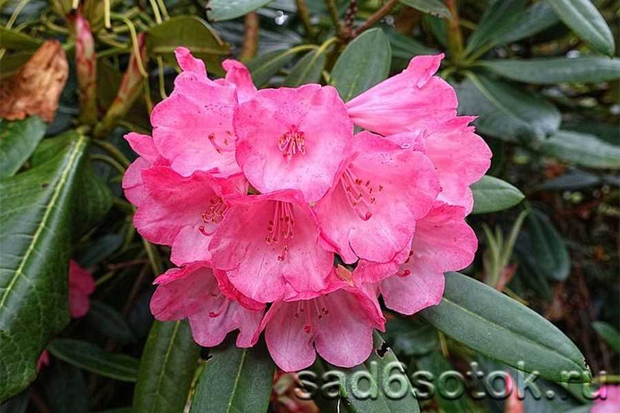 Гибридный вечнозеленый кустарник с высокой морозостойкостью. Встречается в Сибири и в более холодном климате. Образует шаровидные кусты с крупными розовыми цветками, цветущими с мая по июнь.