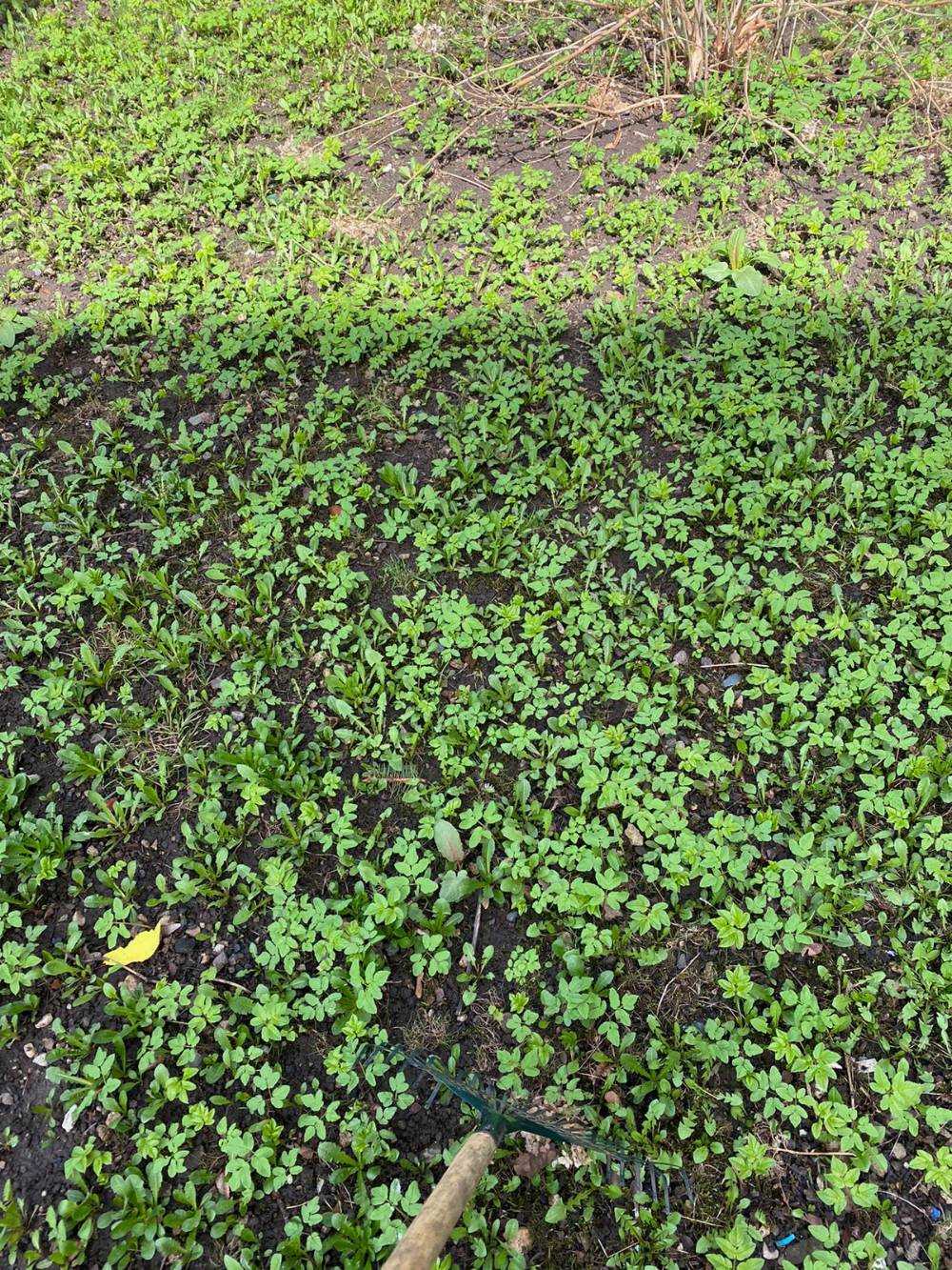 Первые весенние всходы альтернативного нетравяного газона. Кажется, здесь смесь дикой герани, подорожника, одуванчиков