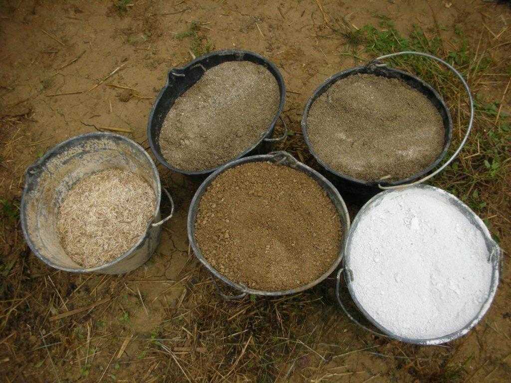 Цемент придает смеси прочности. Его перемешивают с глиной в пропорции 0,2:1, с дальнейшим добавление 3 долей песка