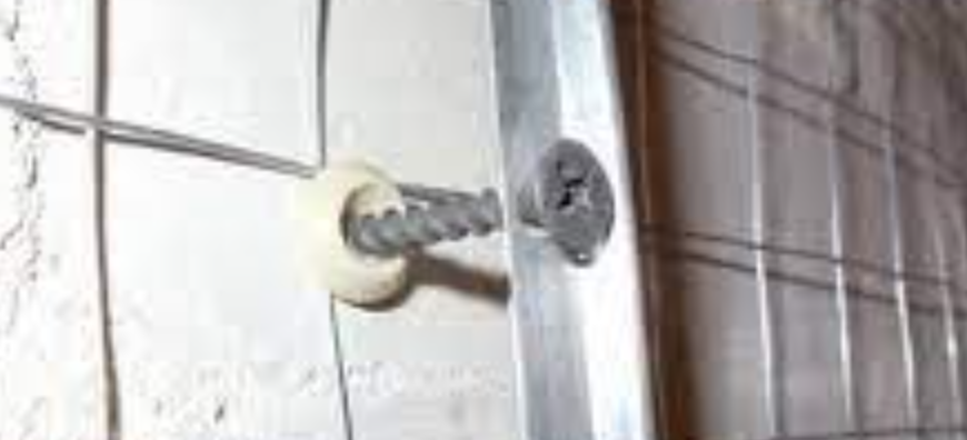Осуществляется разметка по вертикальной линии, а по ней просверливаются 6 отверстий. В них на одном уровне монтируются саморезы. По намеченной линии наносится толстый слой раствора.