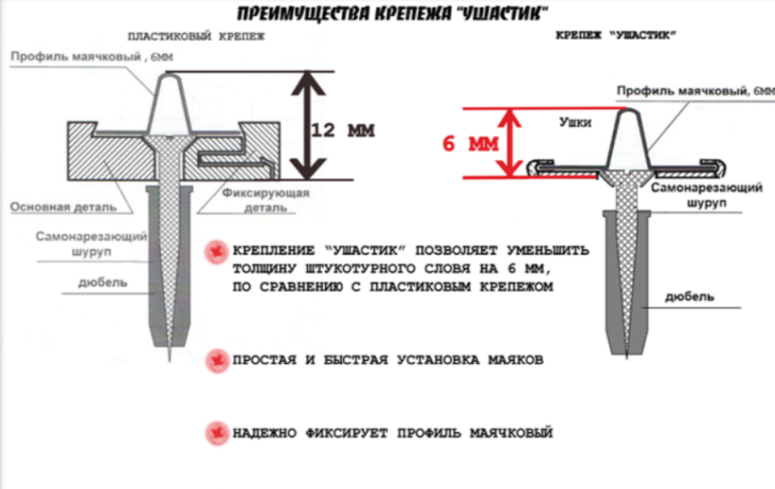 - Маячковый профиль фиксируется по уровню минимум на два крепления;