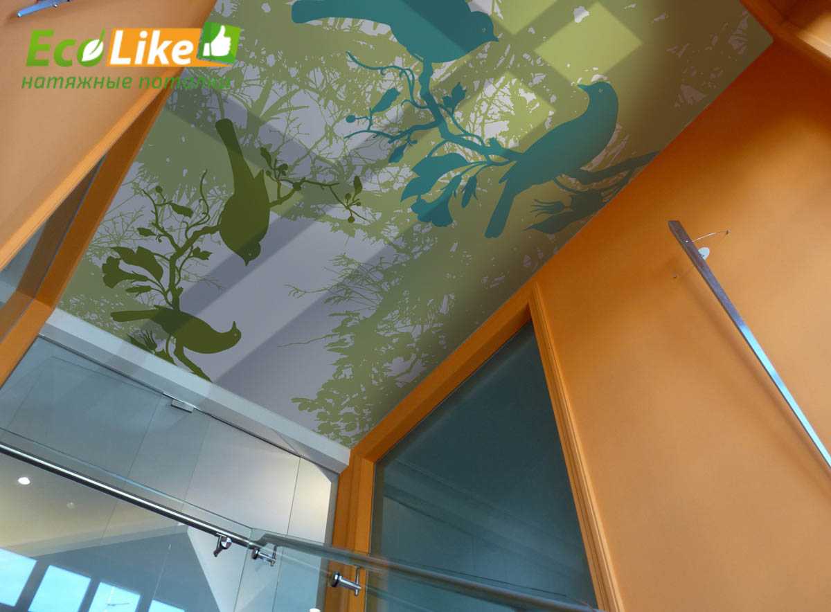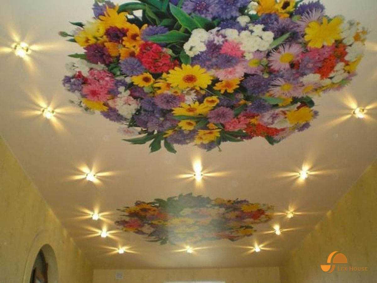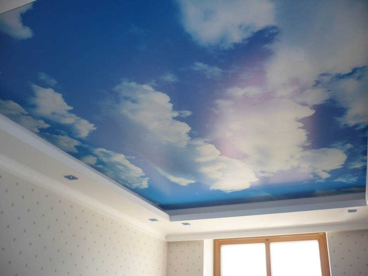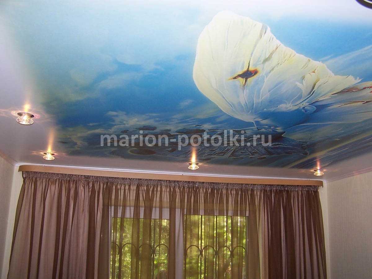 Рисунки выглядят очень естественно, они стойкие и красивые. Отличный вариант для тех, кому надоели простые однотонные потолки. Изображение лучше выбирать такое, которое впишется в стилистику помещения.