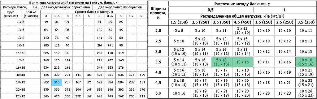 Проверим расчет на соответствие священному писанию – СНиП. В левой табл. на след. рис. ищем балку ближайшего меньшего сечения, это будет балка 180х120 (15х15 = 225; 18х12 = 216). На пролете в 3,5 м она, по СНиП на деревянные конструкции, в междуэтажном перекрытии (пол – аналогичен) выдержит 356 кгс/м (выделено бирюзовым), прекрасно!