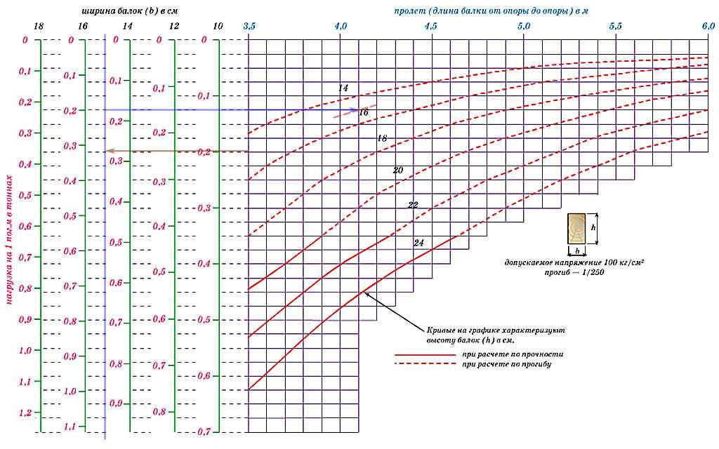 Прежде всего по номограмме на рис. определим предварительно допустимую погонажную (на метр длины) весовую нагрузку на балки. Пользуемся только пунктирными красными кривыми (расчет по прогибу 1:350), чтобы не влезть случайно в область опасных нагрузок. А чтобы не маяться с учетом местных нагрузок на древесину, балки с пролетом до 3,5 м считаем 3,5 метровыми.