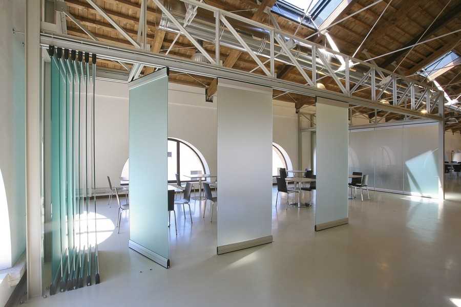 Стеклянные перегородки в подвесном варианте популярны там, где важно сберечь целостность напольного покрытия. Монтаж системы скольжения проводится непосредственно на потолке, вверху на стене или в специальном проеме