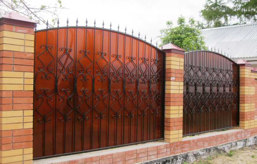 Наиболее интересный способ использования карбоната – монтаж подобного забора с ковкой. В зависимости от индивидуальных условий можно подобрать прозрачные или полупрозрачные листы поликарбоната. Специалисты советуют использовать второй вариант в сочетании с металлическими коваными прутьями. Существует возможность монтажа ПКБ позади секций (с внутренней стороны).