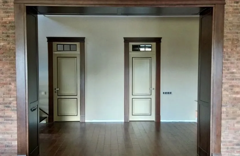 - Для дверей в классическом стиле выбирают модели, богато украшенные декоративными элементами (багетными рамками, карнизами, плинтусными блоками).