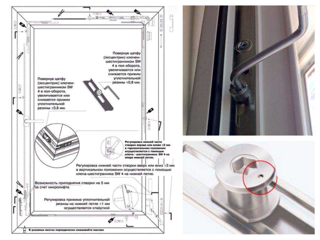 Подправить положение створки можно в ее вертикальной и горизонтальной плоскости. Для этого достаточно немного подкрутить винты, которые находятся в петлях. Их основная задача – это регулировка положения полотна и его прижима. Выполнить эту процедуру нужно, используя шестигранный ключ. В зависимости от того, насколько перекос большой, нужно подкрутить винты только в одном навесе или же во всех.