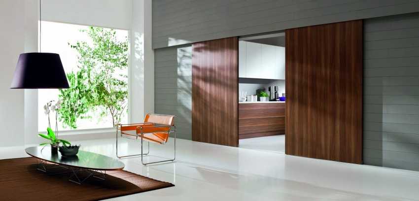 Если же хозяева выявили желание установить кассетную дверь в уже готовом доме, то необходимо обустраивать проем в уже готовых стенах. Такой вариант конструкции обладает одним несомненным преимуществом – полотно располагается в проеме, благодаря чему обладает хорошей звукоизоляцией и не пропустит лишние запахи, например, из кухни.