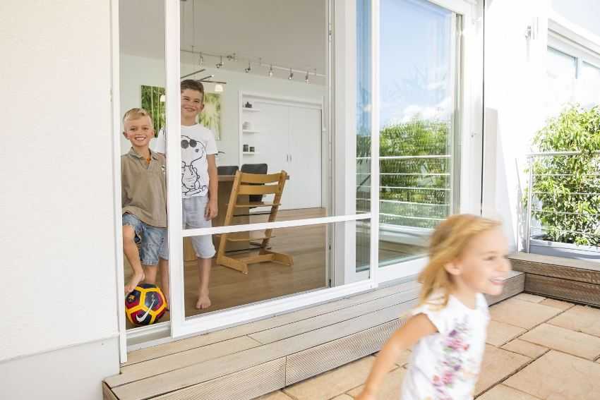 Дверь с москитной сеткой раздвижного типа работает по принципу шкафа-купе. Полотно при этом натянуто на алюминиевый каркас, в нижней части которого имеются ролики, а в верхней — ползунки, для уплотнения механизма используют щеточный уплотнитель.