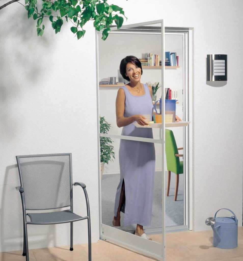 Чаще всего антимоскитная дверь устанавливается на дверь балкона. Но подходящую конструкцию можно подобрать к дверному проему любого размера и назначения: не только для балконной, но и входной двери, выхода на террассу, входа в беседку или оранжерею.
