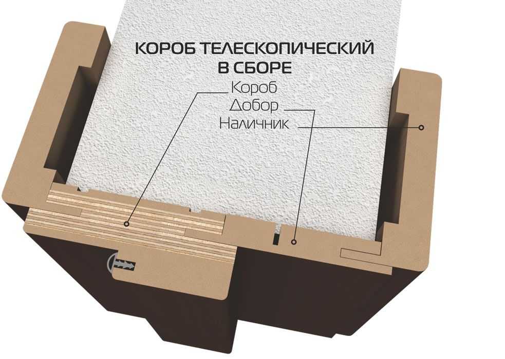 Телескопическая коробка предназначается для монтажа в проемы практически любых размеров. Конструкцией коробки предполагается регулировка ее параметров. Это необходимо, чтобы сгладить перепады размеров проема в стене. Она запросто может сгладить до 5 см перепадов размеров по ширине, а также до 2,5 см по длине. Телескопические коробки оснащены притвором, благодаря которому изделия можно устанавливать в проем, не нуждающийся в отделке. Таким образом, наблюдается двойная выгода: